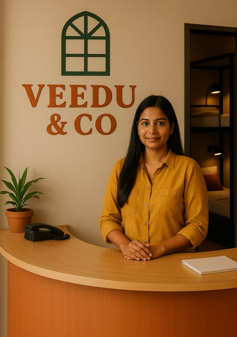 Veedu & Co. offers a safe, homely space for both men & women in our properties in Kerala. Enjoy comfortable beds, clean facilities, and a vibrant community vibe that feels just like home.
